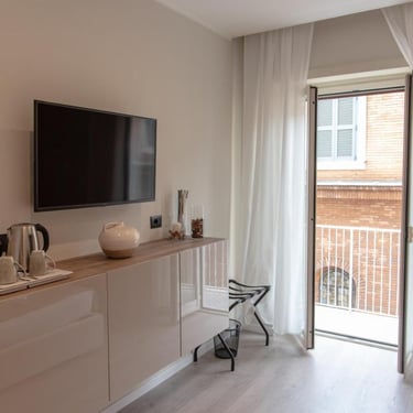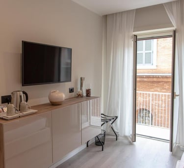 Le Junior Suites con balcone offre un ambiente elegante e accogliente, ideale per un soggiorno di relax. Dotata di un bagno privato moderno, questa camera è perfetta per garantire la massima comodità. Gli ospiti possono godere dell'aria condizionata per un clima sempre ideale, mentre il mini frigo è utile per conservare bevande e snack. È anche presente una macchina di caffè per rendere ogni risveglio un momento speciale.